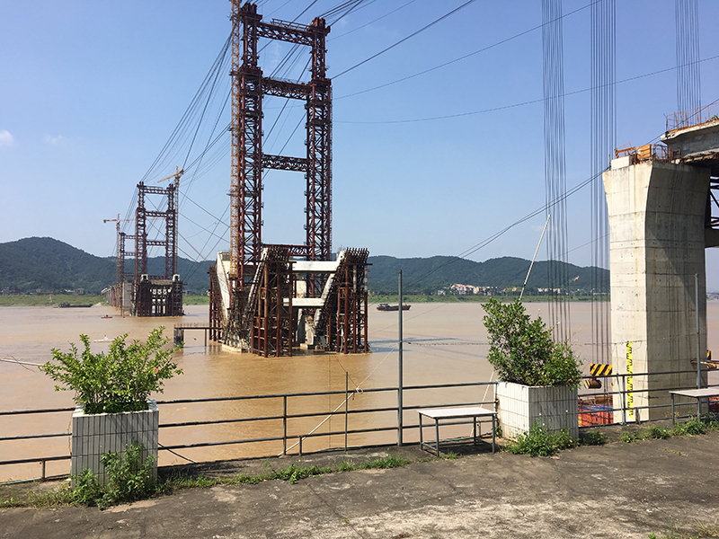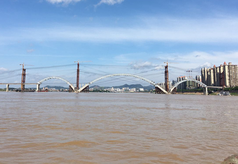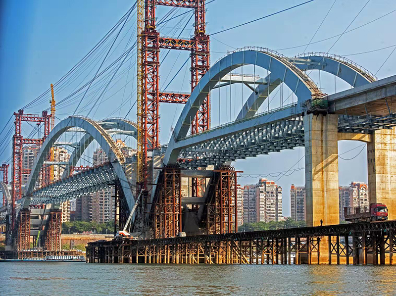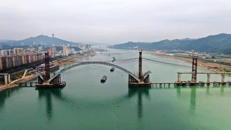 廣西梧州西江四橋為連接梧州河西區(qū)與南岸高旺片區(qū)的中承式雙層連續(xù)鋼箱主梁拱橋,全長1900米,跨徑129+300+129米,采用多塔連跨技術進行安裝,主拱于2019年12月26日合攏。