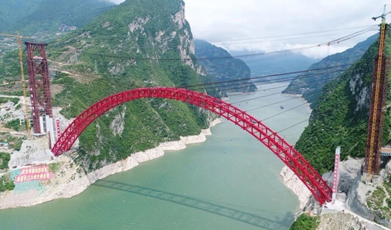 秭歸長江大橋?yàn)橹谐惺戒撓滂旒芄皹?,主?31.2米,全長883.2米,采用2×200噸纜索起重機(jī)安裝,2018年5月22日主拱合龍。