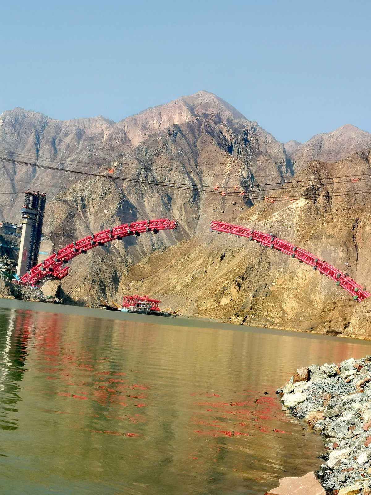 該橋?yàn)橹骺?65米的上承式鋼管混凝土拱橋,全長(zhǎng)492.72米的大橋,采用4×60t纜索起重機(jī)進(jìn)行安裝,2025年1月15日合龍。