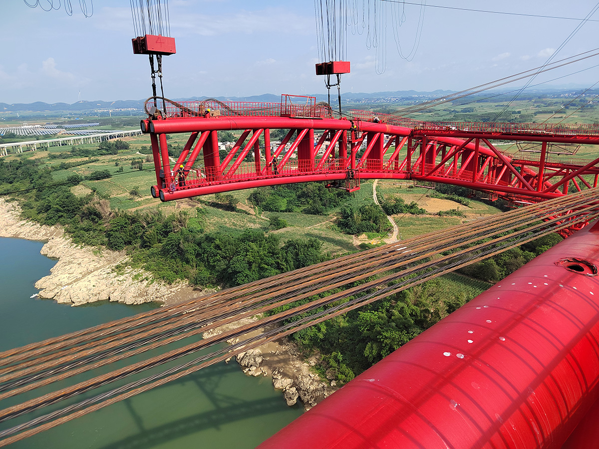 該橋?yàn)橹骺?85米的下承式系桿拱橋,全長1732米,采用2×55t纜索起重機(jī)進(jìn)行安裝,2025年6月16日合龍。