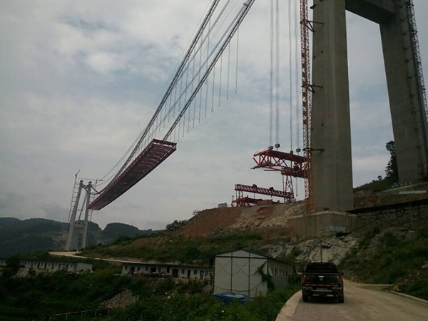 貴州貴甕高速清水河特大橋,主橋2178米,主跨為1130米雙塔單跨鋼桁架加勁梁懸索橋,橋高520米,采用2×100噸纜索起重機安裝加勁梁,建成后成為亞洲山區(qū)懸索橋和世界第二高橋之稱號。