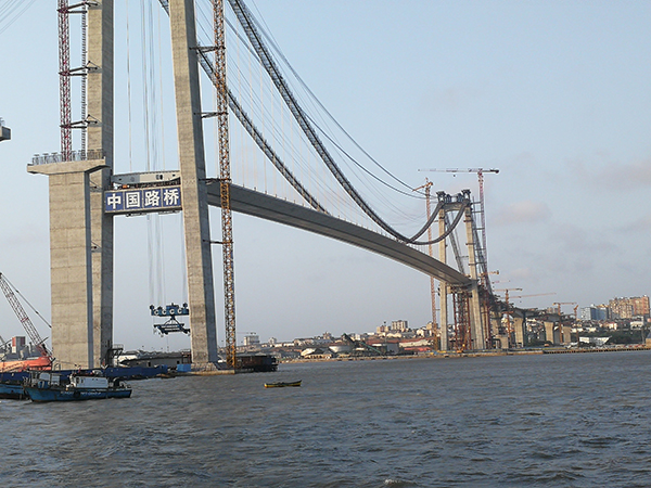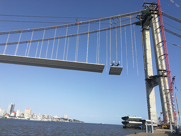 該橋?yàn)殇撓淞簯宜鳂?,主?80米,全長(zhǎng)3034米,采用2×125噸纜索起重機(jī)及旋轉(zhuǎn)吊鉤,25天完成橋面鋼梁安裝,該橋建成后成為非洲第一大懸索橋。