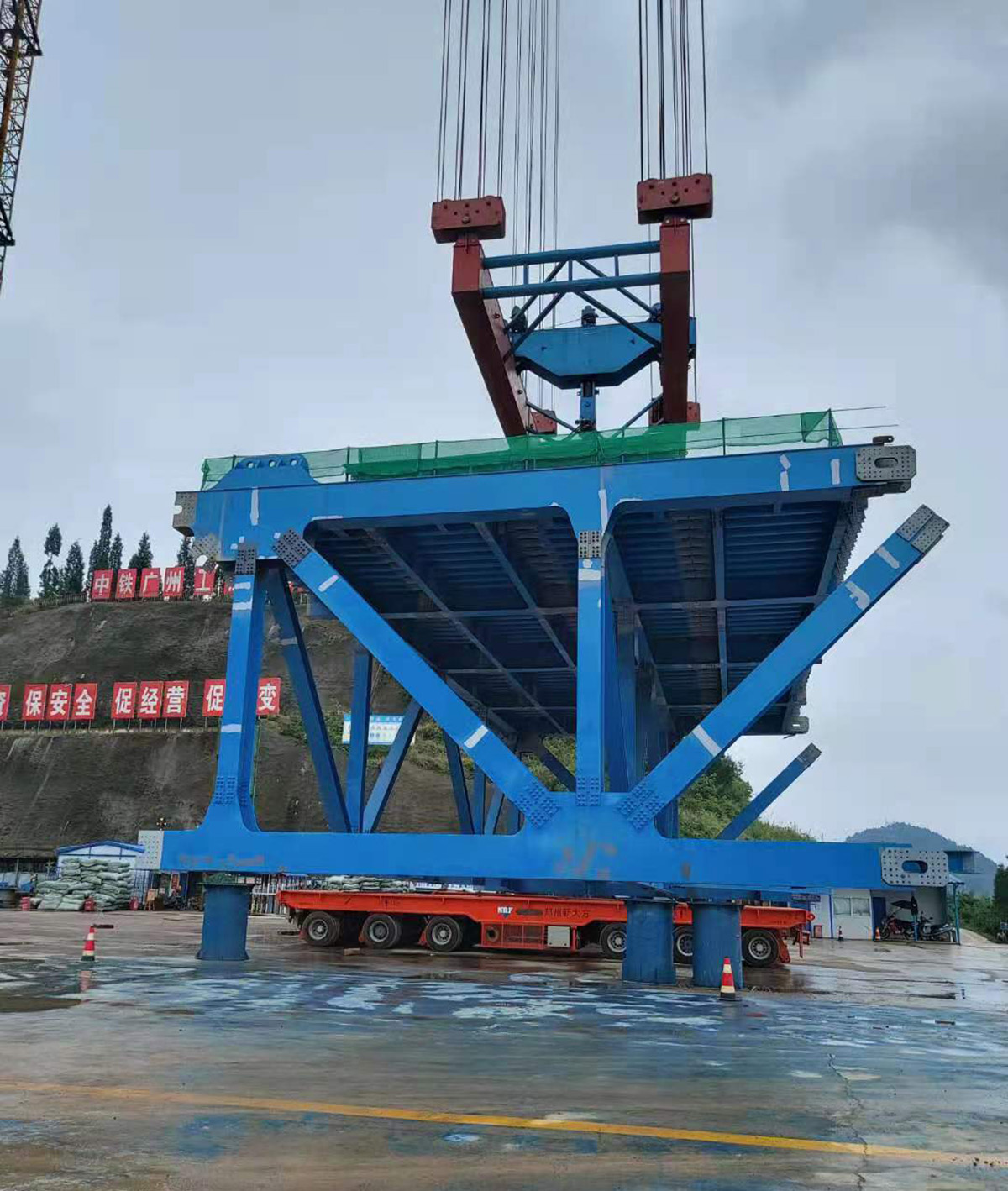 甕開高速開州湖特大橋,為主跨1100米的雙塔單跨鋼桁梁懸索橋,全長1257米,主塔高139米。采用2×125噸纜索吊進(jìn)行安裝,于2021年8月17日合龍。