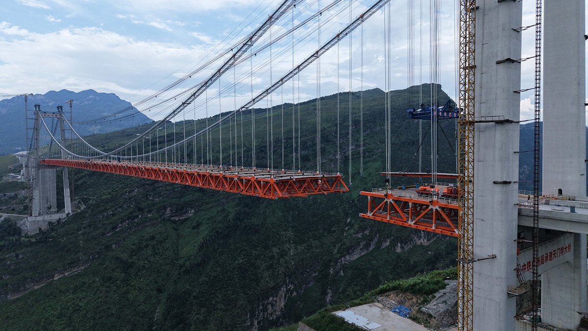 該橋?yàn)橹骺?20米的鋼桁梁懸索橋,全長(zhǎng)1553米,橋面至江面高度差達(dá)560米,是安盤高速公路全線控制性工程之一,采用260t纜索起重機(jī)進(jìn)行安裝,2025年9月23日合龍。